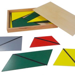• แต่ละชุดประกอบด้วยรุปสามเหลี่ยมแบบต่างๆคละสี ทำจากไม้ และบรรจุในกล่องไม้มีฝาปิด สามารถนำไปสร้างเป็นรูปร่างเรขาคณิตแบบต่างๆ ที่สัมพันธ์กันได้ เช่น รูปสี่เหลี่ยมจัตุรัส รูปสี่เหลี่ยมผืนผ้า, รูปว่าว, รูปหกเหลี่ยม หรือรูปร่างอื่นๆตามจินตนาการ