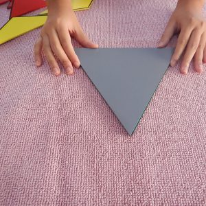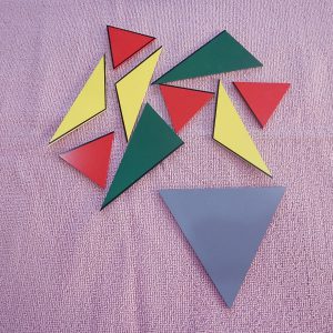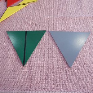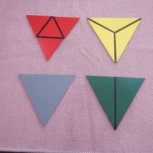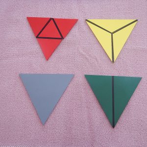 ประกอบด้วย สามเหลี่ยมมุมฉากสีเขียว 2 แผ่น, สามเหลี่ยมมุมป้านสีเหลือง 3 แผ่น, สามเหลี่ยมด้านเท่าสีแดง 4 แผ่น และสามเหลี่ยมด้านเท่าสีเทา 1 แผ่น ทำจากไม้และบรรจุในกล่องไม้มีฝาปิด รูปสามเหลี่ยมแต่ละแผ่นจะมีเส้นดำที่ขอบด้านในด้านหนึ่งหรือทั้งสามด้าน เป็นสัญลักษณ์สำหรับนำไปวางต่อกับรูปสามเหลี่ยมแผ่นอื่นเพื่อให้เป็นสามเหลี่ยมด้านเท่า เรียนรู้รูปเรขาคณิต ฝึกสร้างรูปสามเหลี่ยมด้านเท่าจากรูปสามเหลี่ยมแบบต่างๆ เตรียมความพร้อมสู่การเรียนคณิตศาสตร์