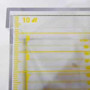• กล่องโปร่งใสพร้อมฝาปิดขนาดประมาณ 10.5 x 10.5 x 10.5 cm มีสเกลบอกปริมาตร 2 หน่วย คือ มิลลิลิตร (ml) และ เดซิลิตร (dl)